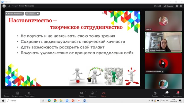 Имидж молодого педагога: ключевые аспекты, самореализация и роль обмена опытом Богданова Вера Викторовна, начальник отдела начального общего образования МБОУ ОДПО «Центр развития образования» городского округа Самара Наставничество как механизм адресной методической помощи. Реализация муниципальной программы «Самара –территория наставничества» Ремезова Лариса Александровна, руководитель Управления «Проектный офис обеспечения качества общего образования и информационно-методического сопровождения ОО» МБОУ ОДПО ЦРО городского округа Самара Позитивная социализация молодого педагога Храмова Елена Александровна, заместитель директора, учитель истории и обществознания МБОУ «Школа № 53» городского округа Самара Роль наставника в становлении молодого специалиста Большакова Ольга Алексеевна, учитель начальных классов МБОУ «Школа № 53» г.о. Самара Первые шаги в профессию. Участие в конкурсах профессионального мастерства Чернышова Ксения Сергеевна, учитель физики и математики МБОУ «Лицей «Престиж» г.о. Самара