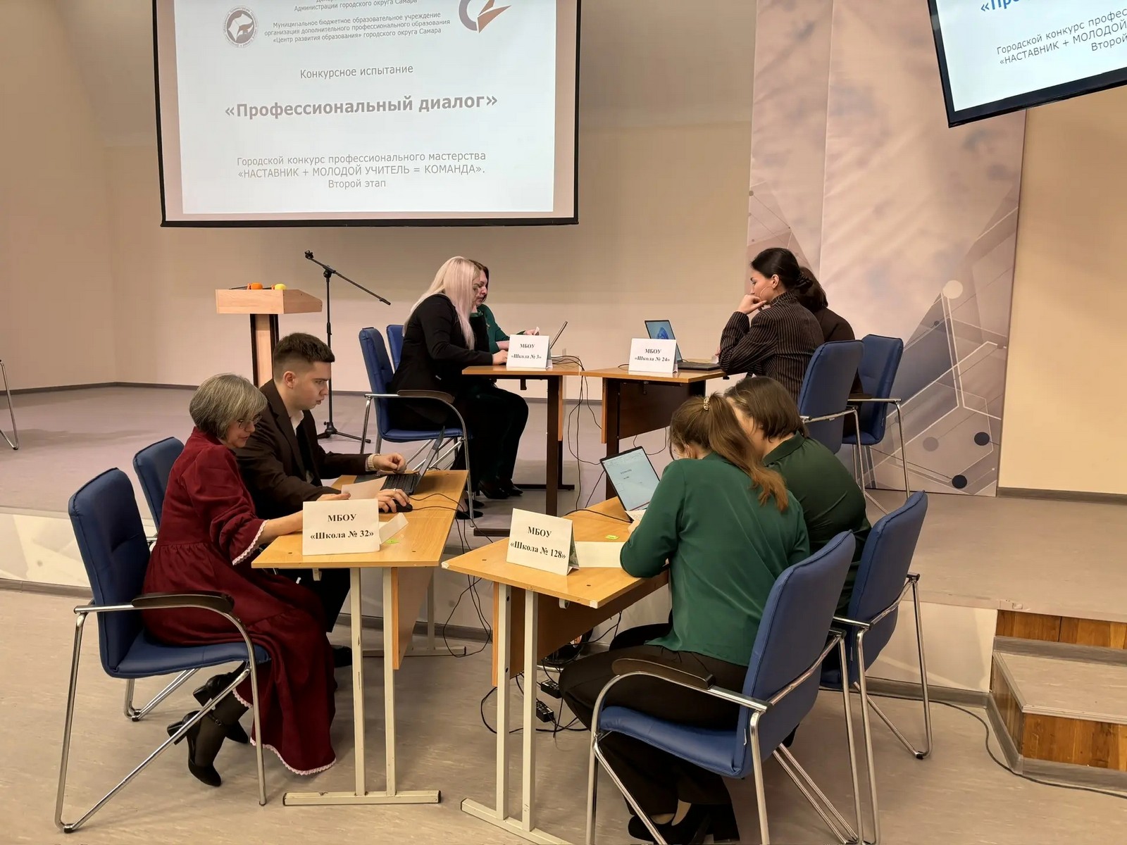 Во второй этап конкурса вышли команды школ №№ 32, 24 (дошкольное отделение), 93, 64, 174, 103,128, 3. Очный этап состоял из двух конкурсных испытаний - «Визитная карточка» и «Профессиональный диалог». «Визитная карточка»: участники представляют опыт работы наставника совместно с наставляемым педагогом под девизом «Мы - команда». «Профессиональный диалог»: участники предлагают собственное решение предложенного кейса на педагогическую тему. Все участники очного этапа достойно справились с конкурсными испытаниями. Жюри подводит итоги!